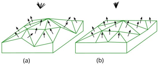 Dispersion of surface normals (represented in black) for (a) a complex triangulated surface and (b) a relatively smooth surface. Surfaces are depicted in green. Normal vector rose diagrams appear above the two surfaces to emphasize the differing vector dispersion.