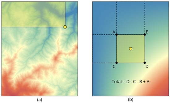 The integral image concept: (a) The untransformed, underlying image. The transformed value for the cell located at the yellow circle will be the sum of the values contained within the yellow rectangle; (b) The transformed image, including an example calculation. The sum value of elevations in the raw image within the yellow window centered on the yellow circle can be derived from the integral image values at points A, B, C, and D. Figure adapted from [18].