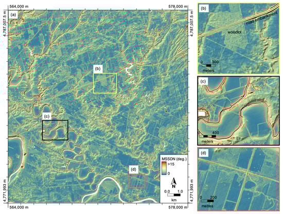 (a) The spatial distribution of σs max for the test DEM produced by the MultiscaleStdDevNormals (MSSDN) tool run with 1 ≤ r ≤ 748, and a nonlinearity scaling factor of 1.7; (b) Inset showing elevated surface complexity associated with the road embankment, a deeply incised river, and a forested area; (c) Inset showing the contrasting roughness on meander point bar and cut banks; (d) Inset highlighting the pattern of σs max associated with varying tillage patterns in adjacent agricultural fields. Images are hillshaded to emphasize topography.