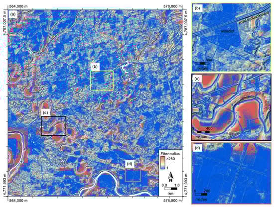 (a) The spatial distribution of the rmax (i.e., the filter radius, in cells) for the test DEM produced by the MSSDN tool run with 1 ≤ r ≤ 748, and a nonlinearity scaling factor of 1.7; (b) Inset showing heterogeneous scale selection in this diverse setting; (c) Inset of longer scales associated with meander bends and floodplains; (d) Inset illustrating the dominance of shorter scales among the relatively flat but texturally complex (due to tillage) agricultural fields. Images are hillshaded to emphasize topography.