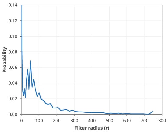 The filter size (D) used to calculate the component summations in Equation (3) determines the scale of roughness characterization and therefore n = D2. D must be an odd integer equal to or greater than three. For multiscale analyses, it can be more convenient to refer to kernel sizes using the filter radius (r), where D = 2r + 1 [18]. Thus, r = 1 coincides with the smallest possible 3 × 3 filter, r = 2 is a 5 × 5 filter, etc. Equation (2) can therefore be thought of as defining σs(r), a function referred to in this paper as the roughness scale signature.