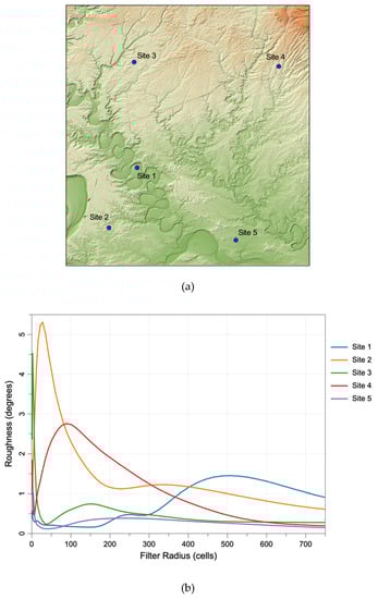 (a) Five sites used for extracting detailed scale signatures of σs from the MSSDN tool. Site descriptions are provided in the text. (b) Roughness scale signatures (σs(r)) for the five sites identified in part a.