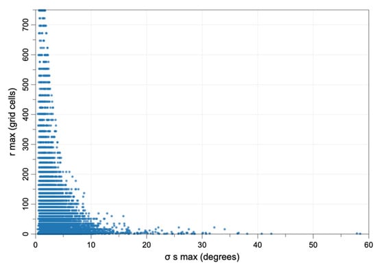 Scatterplot illustrating the relation between σs max and rmax for a sample of 10,000 randomly sampled grid cells from the study site data.