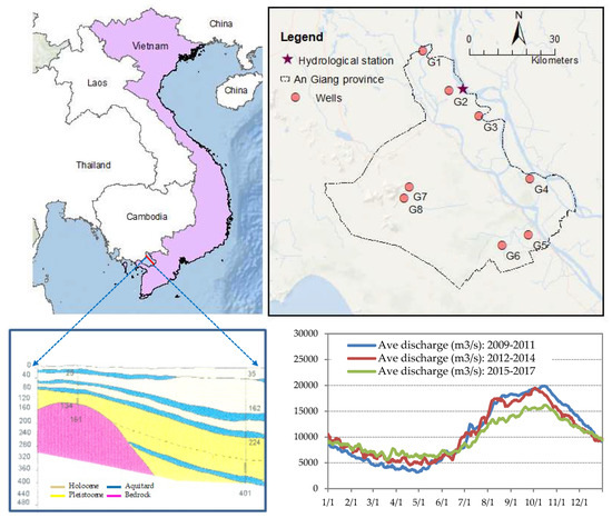 An Giang province belongs to the Southern part of Vietnam with five main aquifers, namely, the Upper Pleistocene aquifer (qp3), Middle-Upper Pleistocene aquifer (qp2-3), Lower Pleistocene aquifer (qp1), Medium Pliocene aquifer (n22), and Lower Pliocene aquifer (n21) [51]. The groundwater was mostly extracted from the Pleistocene and Holocene aquifers since deposited outcrop on the surface was found, which is supplied for domestic and irrigation purposes [52]. In 2014, the total number of existing groundwater wells was 4746, which included 233 unused/discontinued wells. Out of 4513 wells, there were 553 wells used for irrigation and 3960 wells for the domestic water supply [53,54,55].