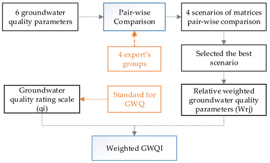We conducted the hierarchy structure composed of three levels (Figure 4). The first level was the overall objective to determine the quantification of the potential of groundwater resources; the second level was the comparison of water quality parameters. We used a fuzzy triangular number scale which was transferred from linguistic terms corresponding to Saaty’s scale (1980) in Table 1 through pair-wise comparison matrices [4,57]. The higher weighting of a parameter shows high importance of that parameter. Finally, the groundwater quality was assessed based on five classes of GQWI.