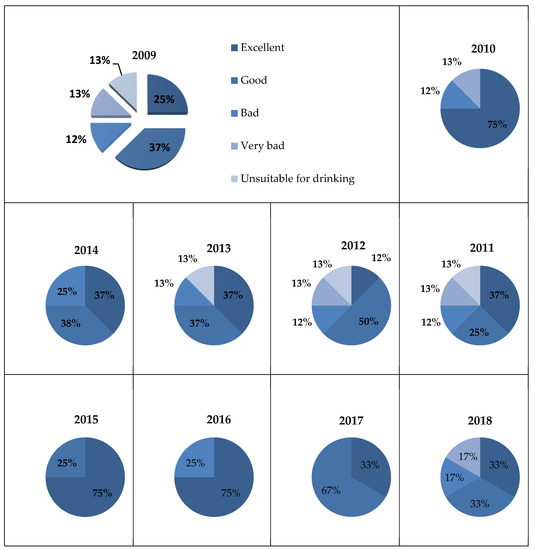 Percentage of groundwater quality at eight wells based on GWQI in the wet season, during 2009–2018.