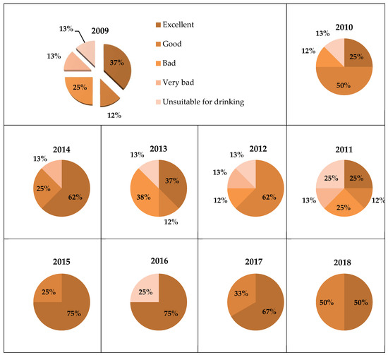The temporal average WQI changes and percentage of the groundwater samples for different categories for the period of 2009–2018 were presented in Figure 5, Figure 6, Figure 7 and Figure 8, respectively. Observed groundwater quality was better in the dry season as compared to the wet season except for NH4+ (Table A1 and Table A2 in Appendix A). Minh et al. [29] also found NH4+ concentration in surface water in the wet season was higher than in the dry season in An Giang. However, we found that the improvement in water quality took place since 2009. The wide range of the GWQI values from 2009 to 2018 show the best and the worst water quality observed at G6 and G4 in two seasons, respectively. In 2018, the GWQI values at G6 were found to be 47 and 41 units in the dry and wet seasons respectively, while the GWQI at G4 were detected to be 132 and 76 units in the dry season and the wet season, respectively. Net groundwater quality improvement occurred in most wells during the years 2009–2018 except G1, G3, and G4 in the dry season. For example, in the dry season the “Very bad water” group of G1, G3, and G4 experienced 202, 176, and 885 units, respectively in 2009, which improved to be “good” quality level in 2014 at G1 (GWQI = 67 units) compared to G3 and G4, with WQI values of 102 and 161 units to be “bad water” quality, respectively (Figure 6). However, G3, an G4 became “bad water” in 2016 and 2018 while G1 became “unsuitable water for drinking” in 2018. Water quality was significantly improved from “very bad water” quality level at G1, G3, G7, and G8 in the wet season to the “good water” and “excellent water” quality level in 2016 and 2018 in the dry season. The water quality of G4 had not been improved during 2009–2018 in both of the seasons. The water quality in well G5 in the wet season first declined from 2009 to 2012, but it has not recovered to achieve “good water” level in 2014 and in 2018. The well G7 and G8 improved significantly in quality during 2009 to 2018 in both of the seasons (Table A3 and Table A4 in Appendix B). Figure 5 and Figure 8 show the percentage of wells with groundwater quality based on GWQI in the dry and wet seasons, respectively. About 39% of wells were in the “bad water” group from 2009 to 2012, but only 25% of wells were considered to be at “bad water” level in the dry season in 2018.