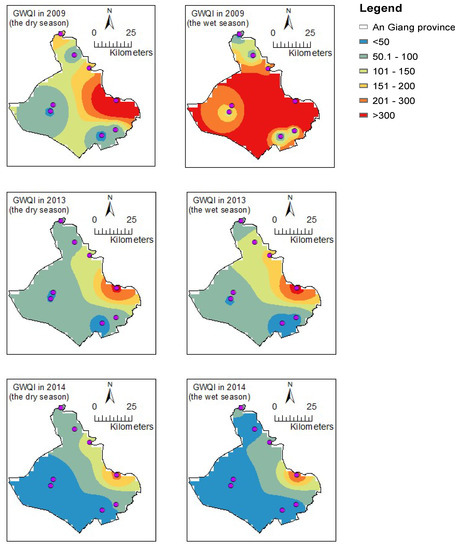GWQI spatial distribution maps were prepared for the years of 2009, 2013, 2014, and 2018, and classified in accordance with GWQI rating system shown in Figure 9. The spatial distribution maps for As are displayed in Figure A1 in Appendix C. The shallow wells (G1, G3, and G4) had the lowest water quality in different years. Being shallow wells, these sampling locations encounter an aquitard (clay) layer as shown in Figure 1, which enhances the reducing condition inside the aquifer and triggers the arsenic mobilization when exposed to oxidative conditions by oxyhydroxide reduction theory [62]. However, the water quality of the G1 well improved in the two seasons since 2014 and decreased again in the dry season of 2018. The shallow wells G1 and G3 are located at the Northeastern part of An Giang, while G4 is located in the Southeastern part of An Giang. The wells G1, G3, and G4 are located between, and close to, the Mekong and Bassac Rivers. It is well-reported that mobilization is prominent in the river flood plain [63]. Therefore, As concentration was the highest for well numbers G1 and G4, as they are located in the vicinity of the river plain. Also, As had the highest weightage among all water quality parameters. High As concentration led to poor water quality.