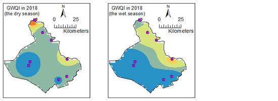 In this study, we calculated the GWQI based on the weighted arithmetic index method recommended by the World Health Organization (WHO) using Equation (6). The weighted arithmetic index method can be used with different parameters. It is flexible for assessment and management of water quality because it was applied in many previous studies [16,60,61], Groundwater quality was classified based on rating values of GWQI in Table 3.