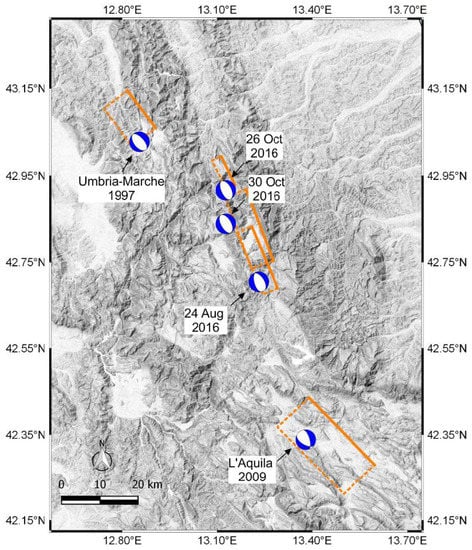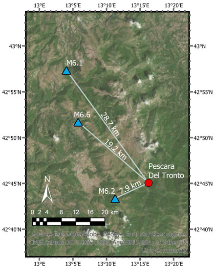 The 2016 Italy earthquakes devastated communities along the Apennine Mountain Range along a series of normal faults with rake angles of to . The August 2016 earthquake caused significant damage in the following villages: Arquata del Tronto, Accumoli, Amatrice, and Pescara del Tronto [4,5]. The October events caused significant damage primarily in the villages of Visso, Ussita, and Norcia [2,6], and exacerbated the damage in Pescara del Tronto. Other analyses of the 2016 earthquake sequence include geohazard forensics of Norcia in Barone and Di Maggio [9] as well as numerical modeling of ground deformation in Valerio et al. [10], the mechanisms of the earthquakes in Zhong et al. [11], and Amatrice building damage assessment using synthetic aperture radar (SAR) in Karimzadeh and Matsuoka [12]. The earthquake events appear in a gap between two recent M6.1 events—the 1997 Umbria-Marche earthquake to the north-west and the 2009 L’Aquila earthquake to the south-east. Figure 1 from Stewart et al. [2] depicts the three major earthquakes in relation to the Umbria-Marche and L’Aquila earthquake events. This gap was determined to be an area of elevated risk prior to the 2016 earthquake events [4,5].