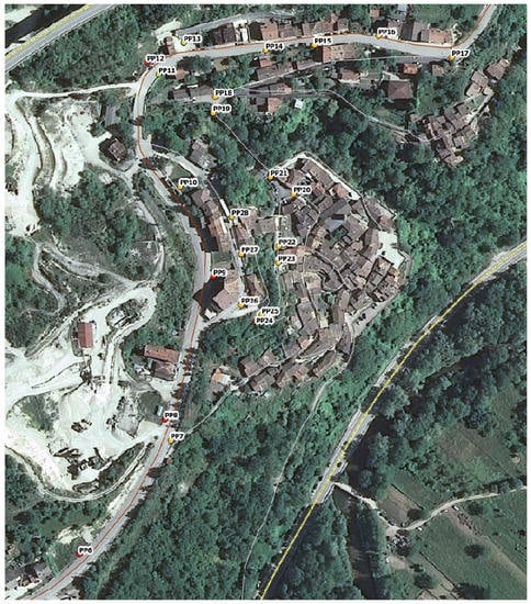 Locations of the 23 GCPs throughout Pescara del Tronto (red denote fabricated GCP markers, and yellow markers denote natural formation GCP markers [1].