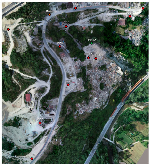 Locations of the 12 GCPs in Pescara Del Tronto used in the 2018 Optimized model (red represent surveyed fabricated GCP markers, green indicate natural GCP markers, and orange is the base station location).