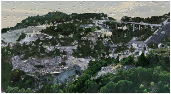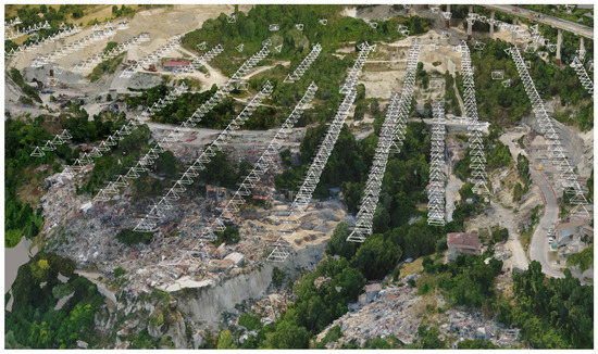 To overcome the downsides of the nadir grid approach and obtain better orthogonal views of Pescara del Tronto, a view-planning algorithm delineates optimized photo locations and angles through greedy heuristics [25]. View-planning identifies the best sensor locations for observing an object or site by planning oblique images for optimized SfM [26,27]. As shown in Martin et al. [23], when comparing models that use optimized view-planning with ones that use standard grid patterns, models using additional view-planning yield a greater accuracy of up to . These results led to the use of algorithmic view-planning (specifically model-based view-planning) at Pescara del Tronto.