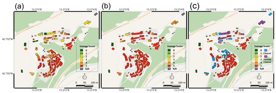 Map of building damage and cleared areas in Pescara Del Toronto following the October and August 2016 earthquakes and 2018 follow-up visit. (a) After the August 2016 earthquake; (b) After the October 2016 earthquake; (c) 2018 follow-up visit [1].