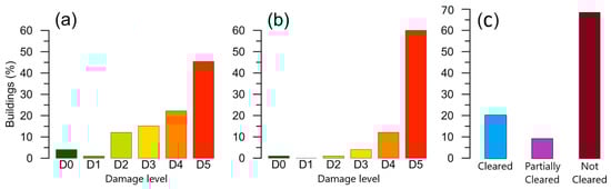 Bar graph showing the level and percentage of buildings damaged between the October and August 2016 earthquakes and the percentage of buildings cleared as of July 2018. Total building areas counted were 143. (a) After the August 2016 earthquake; (b) After the October 2016 earthquake; (c) 2018 follow-up visit. Modified from the GEER 2016 report [1].