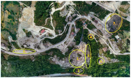 Pescara del Tronto Locality Map (similar to GEER map) [1]. Areas of Focus: 1—Structural Damage of Residential Area, 2—Landslides Impacting the Strada Statale, 3—Failed Retaining Wall Surrounding the Village, 4—Localized Landslides along the gully wall, 5—Landslide on Northern Slope of the Village, 6—Haul Road and Exposed Pipeline, 7—Large Slope Failure North of the Village.