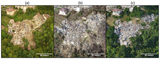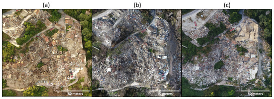 Location 1: Progression of structural damage and cleanup in the densely populated area of Pescara del Tronto; (a) September 2016, (b) December 2016, and (c) July 2018.
