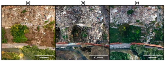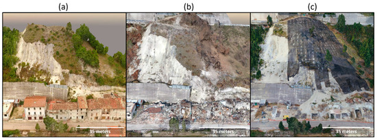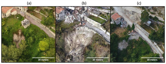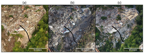 Note Figure 21, the first two examples (a) and (b) appear as part of the GEER report in Stewart et al. [3] and the third (c) is from a combined nadir/optimized model generated July 2018. After the first earthquake, the gully wall depressed slightly; however, after the second earthquake in 2016, the 9 m thick and 20 m wide slope catastrophically fell leaving the 12 m scarp at an angle of nearly , and the residential structure after August 2016 has crumbled into the gully as of November 2016 [3]. As of July 2018, the slope continues to erode and fail, but there have been some repairs to the road and slope. The stairs in the upper right of the shown portion for all three models, are more accurate in the optimized model than in the older models.