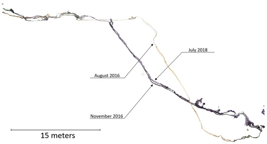 After the images and ground control points were obtained during the 2016 reconnaissance projects, 3D models developed and recorded current conditions and detected deformations that took place between the two events [6] (see Figure 5 and Figure 6 for the models). The models were made through BentleyTM ContextCapture modeling software which determines 3D point locations within a scene using GPS and camera metadata. The data is stored within the photos and used to calculate interspatial intersections—molding/stitching the photos together by identifying matching figures in the overlapping photos as in Koenderink and van Doorn [20]. SfM assigns point x, y, or z positions to similar features in each picture and spatially stitches each point together into a cohesive object [21]. However, the quality of the final product is generally determined by the skill and experience of the pilot constructing a grid overlap and obtaining additional images through manual flights.