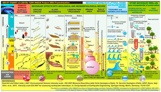 - Silva, P.G.; Guerrieri, L.; Michetti, A.M. Intensity scale ESI 2007 for assessing earthquake intensities. In Encyclopedia of Earthquake Engineering; Beer, M., Kougioumtzoglou, I.A., Patelli, E., Au, S.K., Eds.; Springer: Berlin/Heidelberg, Germany, 2015; ISBN 978-3-642-35344-4. [Google Scholar]