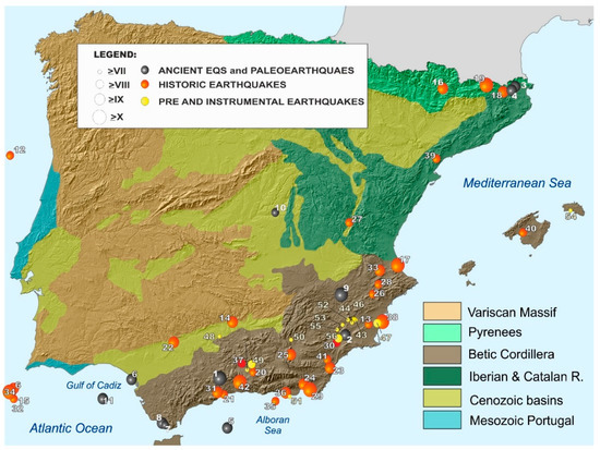 In summary, analyses of EEEs try to enlarge the temporal period of macroseismic observations and data some thousand years ago to the more recent geological past, commonly to the last 10,000–12,000 years BP (i.e., Holocene epoch) [1,5,6]. This fact is essential to perform the scientific analysis of a particular geological process (Seismic Cycle) which normally exceeds the temporal scales commonly considered in the conventional seismic catalogues [5]. In the case of Spain, the official catalogue of historical earthquakes extends to the year 800 BCE [7]. However, as noticed in recent macroseismic reviews, the historical data are scarce and doubtful before the year 1000 CE, and nearly accurate for strong events from the 14th–15th centuries [8,9,10]. This implies about 500–600 years of useful macroseismic record for Spain, which in turn are the approximate return periods used in SHA for seismic codes [11,12].