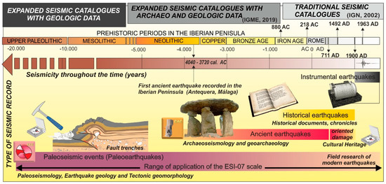 Type of information and temporal extent of the different types of earthquakes (paleo, ancient, historical, pre-instrumental and instrumental) in relation to the time-record for the different prehistoric and historic periods in the Iberian Peninsula. The temporal scale highlights representative historic cut-off dates for the type of information of the catalogued events.
