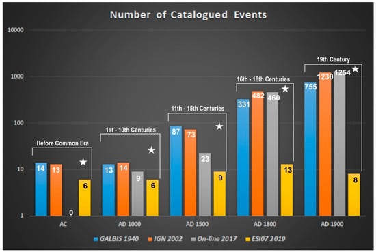 Number of catalogued earthquakes in the different seismic catalogues of Spain for different temporal periods. Stars and yellow bars identify the strong earthquakes included in ESI-07 Catalogue for the Iberian Peninsula [10] reviewed in this paper.