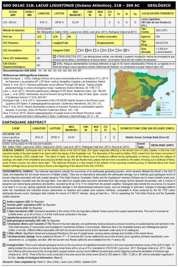 - Paleoearthquakes or paleoseismic events (Code: GEO) with only geological record, albeit in some cases supported by limited geoarchaeological data. This type of event covers from the most ancient historical periods in Spain (c. 10th century CE) to the onset of the Holocene epoch (c. 11.2 ka BP) and they are not included in the conventional seismic catalogues as commonly occurs with the ancient earthquakes. These events are documented in scientific papers published during the 21st century, and they correspond to fault-trenching analyses (primary surface ruptures) or EEEs analysis (primary and secondary effects). Those related to fault-trenching studies correspond to surface-faulting events (≥7.0 Mw) that occurred during the late Holocene. However, there are fault-trenching data for some ancient earthquakes such as the Tobarra (Albacete) that occurred around the 500 CE [26] or Historical events such as the Arenas del Rey (Granada) that occurred in 1884 CE [27]. Another case of paleoearthquake largely documented by secondary EEEs is the 218 BCE Lacus Ligustinus event recorded in the present “Doñana Marshlands” (an ancient lake by that time) at the Guadalquivir river outlet in the Gulf of Cádiz (Atlantic Ocean) [28]. These authors identify an earthquake-tsunami event similar to the 1755 CE Lisbon event flooding the ancient roman embayment and breaking the existing littoral spit-bars. Other authors document this event in turbidite layers obtained in deep sea cores in the Atlantic ocean near the Gorringe Bank [29] or in other marshlands of the Gulf of Cádiz, such as the Odiel and Tinto river mouths at Huelva or the Guadalete river mouth near Cádiz [30,31]. It is to note that the Lacus Ligustinus event is the unique geological event with historical written records describing the destruction of Cádiz just before the march of Hannibal to Rome across the Alps in the beginning of the Second Punic War in 218 BCE [32]. All these paleoseismic events are supported by a significant number of geochronologic data (14C, OSL and TL data), as is also the case for most of the ancient earthquakes further documented by archaeological data.
