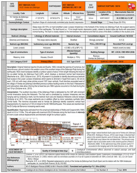 - Silva, P.G.; Rodríguez-Pascua, M.A.; Giner-Robles, J.L.; Pérez-López, R.; Lario, J.; Perucha, M.A.; Bardají, T.; Huerta, P.; Roquero, E.; Bautista Davila, M.B. Catálogo de los Efectos Geológicos de los Terremotos de España, 1ª Ed; Riesgos Geológicos y Geotecnia 4. IGME: Madrid, Spain, 2014; p. 352. (In Spanish) [Google Scholar]