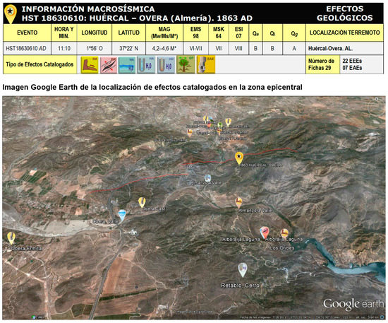 Example of Google Earth image extracted from the kmz file produced for each of the 16 selected earthquakes with “full event files”. The example displays information for the macroseismic area of the AD 1863 Huércal-Overa earthquake [10].