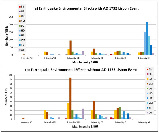 The Figure 11 illustrates the distribution of triggered EEEs listed in the “event files” for the whole number of catalogued earthquakes by their maximum intensity. The analyzed data total 976 EEEs including those of the AD 1755 (Figure 11a) but are only 489 without the mentioned event (Figure 11b). The different distribution of EEEs is also noticeable when considering or not the Lisbon Event, which displaces the statistical mode to intensity XI due to the large number of hydrological effects (HA, HD and WA) reported for this earthquake (Figure 11a). On the contrary, removing the Lisbon EEEs, the statistical mode is clearly located in intensity VIII, where the most frequent effects are slope movements (SM), ground cracks (GK) and ground liquefaction (LQ) with an amount of 204 EEEs (Figure 11b), which practically doubles the number of EEEs for intensities IX and X (around 100 each). This is a statistical bias because intensity VIII events are the most numerous among the catalogued Spanish events (Table 1 and Table 2). In any case, it seems clear that the minimum Imax value to produce secondary earthquake effects with a relative long-lasting geological record is intensity VII.