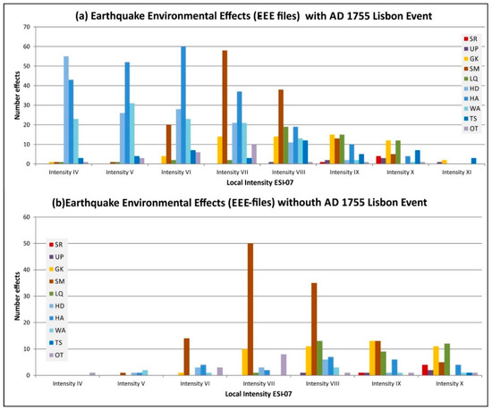 Figure 12 displays the catalogued EEEs by their intensity level, but only for the 16 selected earthquakes with “full event files”, which sum up to a total of 811 records. Again, the comparison of the diagrams with and without the AD 1755 Lisbon event offers a very different distribution of the number and type of catalogued EEEs. Once the large amount of hydrological and tsunami effects produced by the Lisbon event are removed, again intensities VII and VIII collect the largest number of ground effects (SM, GK and LIQ) (Figure 12b). In many cases, the catalogued ground cracks are related to lateral spreading linked to ground liquefaction or to slope movements. This last category of ESI-07 effects is the more abundant one in the analyzed earthquakes, but the SM peak for intensity VII in Figure 12 is again a statistical bias due to the large amount of slope movements catalogued for the 2011 Lorca earthquake (Figure 12b). It is also noticeable that primary effects start to be observable for intensity VIII, but the few cases of surface ruptures occur for events of intensity ≥IX (Figure 12b). This is the general case for inland Spain, where surface faulting events are very rare, but the occurrence of extensive secondary earthquake effects is common. These mainly include hazardous slope movements, ground liquefaction and ground cracking processes in inland events, but also damaging tsunamis in the Gulf of Cádiz (Atlantic Ocean) and Alborán Sea (Mediterranean Sea) around the Gibraltar strait (Figure 2). In fact, the strongest earthquakes occurred within the Iberian Peninsula have moderate magnitudes around 6.0–7.0 Mw [7,19,23] but they triggered strong intensity levels up to IX–X as a consequence of the participation of geological effects in environmental and building damage. This is of special interest for the dangerous earthquake-tsunami events around the Gibraltar strait zone. In this sense, Figure 11 and Figure 12 display the number of catalogued EEEs with and without the data corresponding to the 1755 Lisbon earthquake-tsunami. In both cases, the noise introduced by this special “Atlantic Event” is clear in relation to the EEEs commonly triggered by the strongest earthquakes that occurred within the Iberian Peninsula.