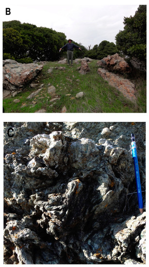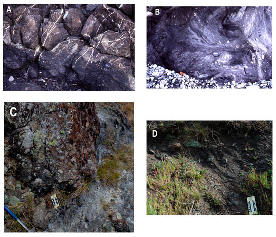The serpentinite matrix of the Jenner Headlands Mélange exhibits a scaly fabric that contains a variety of exotic blocks and clasts [53]. The matrix is anisotropic in structure with anastomosing shear planes, and it wraps around clasts and blocks (Figure 7A). The clasts and blocks range up to several tens of meters in long dimension and are rounded to lensoidal in shape [53]. Block rock types include typical metamorphosed OPS rocks [metabasites (metabasalt and metagabbro), metachert, and metasandstone] and conglomerate plus hornblende and glaucophane schist with chlorite-actinolite rims and veins, chlorite and serpentinite schists, and rare eclogite. Essentially, all of the blocks are exotic.