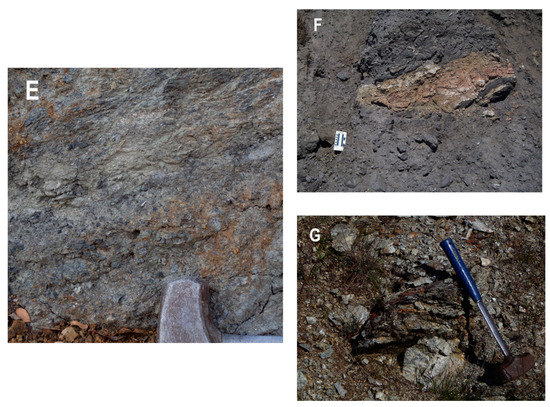 Several other mélanges that have been designated as tectonic in origin are listed in Table 1. These include the Garzas Mélange, the Gerber Ranch Mélange, and the Hunters Point Mélange. The Garzas Mélange (GZ on Figure 1) is a shale-matrix mélange that is exposed over a wide area in the northeastern Diablo Range [11,45,49,102]. Preliminary regional structural analysis suggests that the mélange may not be as thick as it seems, inasmuch as the folding patterns shown by Raymond [2,45,87] for the region result in repetition of mélange sections. The mudrock-matrix Garzas Mélange has a relatively diverse range of native and exotic block types, including blocks of so-called “high-grade” glaucophane schist [11,49]. Scaly and brecciated textures are common in the matrix (Figure 2E) and define an anisotropic fabric that is also reflected by S-C fabrics in metawackes [88].
