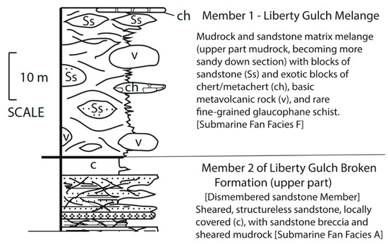 Section of Liberty Gulch Mélange (member) and underlying Dismembered Formation Member 2 of Liberty Gulch Broken Formation. Mélange (submarine fan facies F) conformably overlies Dismembered Sandstone Member 2, a sheared submarine fan facies A unit with local interbedded sheared mudrock (modified from [32]).
