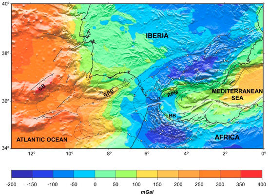 Bouguer gravity anomaly map of the Iberia–Africa plate boundary region. Tectonic background as in Figure 1. GB: Gorringe Bank; GPB: Guadalquivir–Portimao Bank; RPM: Ronda Peridotite Massif; BB: Beni–Bousera peridotites.