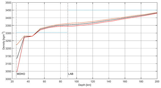 Average density of the considered models (black solid line) and its 1 accuracy (red solid lines); mean density in the lithospheric upper mantle and in the asthenosphere from the LithoRef18 model [28] (blue dotted line); Moho and lithospheric asthenosphere boundary (LAB) from LithoRef18 (black dashed lines).
