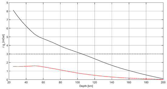 Omission error STD (black solid line) as a function of the maximum depth of the model and accuracy of the mantle gravitational effect (red solid line) from to a constant as a function of .