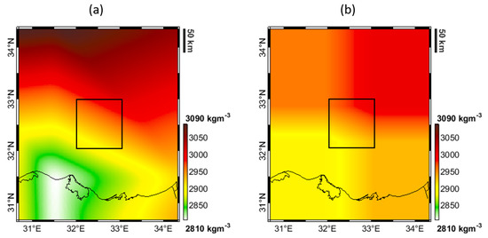 To give the reader an example, Figure 5 shows the density model at a depth of 22 km from the CRUST1.0 model (a), and the density model extrapolated by the nearest neighbor algorithm (b). The black rectangles at the center of each map represent the study area. Please note that within this region both the models have the same density.
