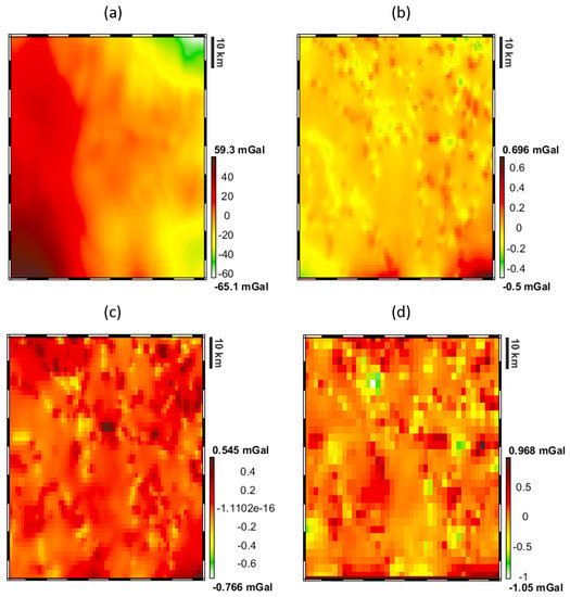 To evaluate and the easiest way is again by means of an empirical method. We can start by considering an a-priori model with the maximum available resolution (in our example we used as a-priori model the 3D model from [15] with a maximum lateral resolution of 500 m). Then we downsample the model by a factor 2, 3 and 5 obtaining lateral resolutions of 1000 m, 1500 m and 2500 m, respectively. Please note that the number of prisms in the x and y directions decreases from in the initial model to just for the model with resolution 2500 m. In Figure 6 the signal of the a-priori model (a), and its residuals with respect to the signals generated from the different downsampled models (b), (c), and (d) are shown. It can be seen that even considering the 2500 m resolution model (case (d)) the STD of the residuals is of just mGal, which is well below the 3 mGal level. A further downsampling could be possible considering the observation error; however, in this case, we stop the downsampling since the problem has a dimension that can be numerically handled by the inversion SW used.