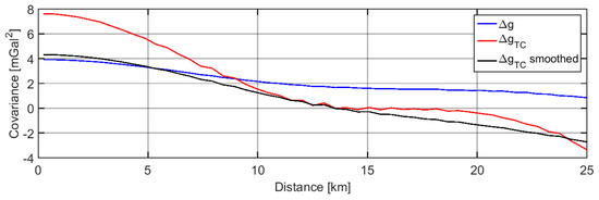 The use of is justified because the gravitational effect of the topographic layer is among the largest signals and for sure it is the one at highest frequencies. Moreover, as the geometries of topography and seabed are in general well known from Digital Terrain Models (DTM), their corresponding gravitational effects can be computed in a quite accurate way. However, when selecting the DTM to compute , we must be sure that it is consistent with the observed . In fact gravity anomalies are obtained by means of the application of filters or regularizations to the raw observations and, consequently, they do not contain the full spectrum of the gravitational field. Usually the very-high frequencies are removed. To give an example: let examine a grid of gravity anomalies from a global gravity field model up to degree 2190; it is well known that the maximum spatial resolution achievable is around 10 km half-wavelength [34]. Now, a DTM used to compute the Bouguer anomalies from such a global model should be chosen in such a way that its gravitational effect has a similar spatial resolution. If it is not the case, when applying Equation (6), we will remove the signal frequencies contained in the two terms and , but we will also add the high-frequency content of to (with opposite sign). A possible way to deal with this problem is to compare the stochastic characteristics (e.g., in terms of covariances) of and applying a low-pass filter (e.g., moving average) to the DTM, and therefore smoothing . Figure 8 shows the covariance of (blue line) and of (red line) for the considered example.
