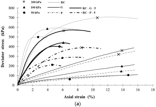 Deviator stress versus axial strain for pure red clay, powder and granulate, and for RCR mixtures, under confining pressure 50, 100, and 200 kPa: (a) 5% addition of (P) or (G), (b) 10% addition of (P) or (G), and (c) 25% addition of (P) or (G).