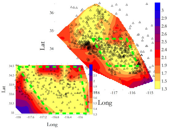 Magnitude completeness in Southern California. The value of can be obtained by the color bar and triangles identify the location of seismic stations. Green dashed lines define Region 1. Region 2 is the complement to Region 1 with respect to the entire Southern California (From [19]).