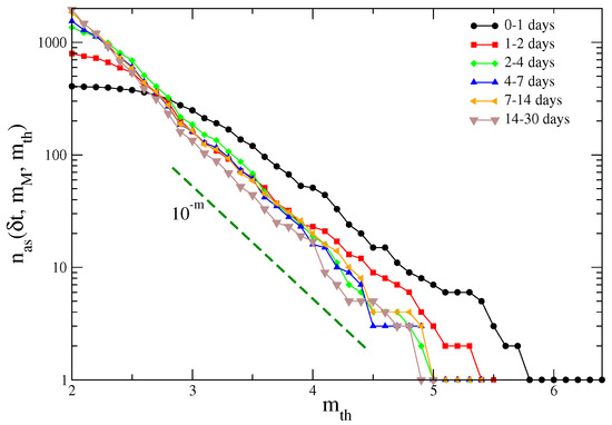 where is the main shock magnitude and d and are fitting parameters. We refer to Equation (2) as the Kagan–Helmstetter formula with the best fitting parameters and days, when time is measured in days. In Figure 2, we plot the experimental aftershock magnitude distribution evaluated for different temporal intervals after the Landers earthquake, in Southern California. Experimental results show a magnitude distribution with an about flat for values , whereas curves appear parallel on a semi-logarithmic scale for consistently with a GR law with . The crossover magnitude is in agreement with Equation (2).