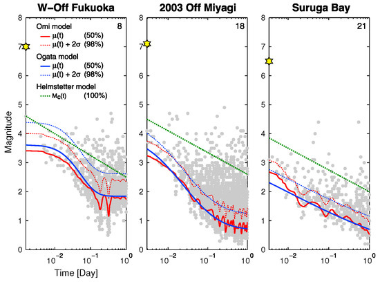 In Figure 3, we plot the results by Omi et al. [9] for and for three aftershock sequences in Japan. These results are compared with the Ogata–Hirata formula (Equation (5)) and the Kagan–Helmstetter formula (Equation (2)). Figure 3 shows that the Omi and the Ogata–Hirata models give similar behavior for and are able to capture the time variation of the detection rate. In contrast with these two models, since the parameters of the Kagan–Helmstetter formula are fixed for all sequences, it cannot reproduce the diverse recovering dynamics of the completeness magnitude that considerably depends on each aftershock sequence. The comparison of the forecasting skill of these three methods, for 38 Japan aftershock sequences, shows that the Omi method performs slightly better than the Ogata–Hirata methods and much better than a Kagan–Helmstetter formula [9].