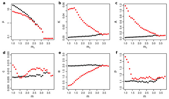 Different panels correspond to the ETAS parameters (see axis labels) estimated from the Kumamoto aftershock sequence with different magnitude thresholds. The red and black dots are the estimates based on the original and the replenished datasets, respectively. Unit of measures are for respectively and the other quantities are adimensional except which represents the productivity from an event of magnitude . From [13].