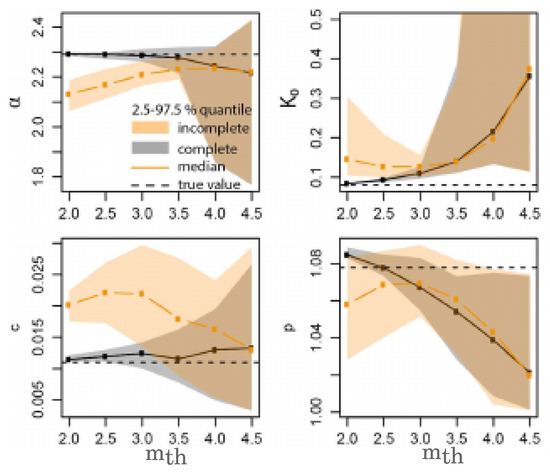The ETAS parameters are plotted against for synthetic catalogs simulated with parameters from Southern California (gray) and compared with the parameter for the incomplete synthetic catalog (orange). The “true” parameter values are plotted with black dashed lines the grey shadowed region represents the quantiles of 30 synthetic ETAS catalogs. The orange shadowed region represents the quantiles of 30 synthetic ETAS incomplete catalogs. From [13].