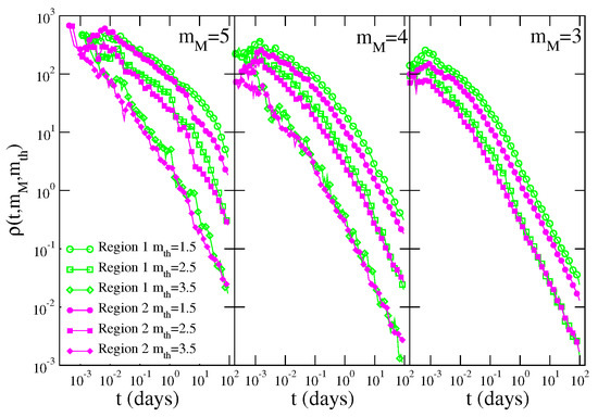 As explained in Section 2 the static is a local quantity which depends on the local density of the seismic network , as illustrated by Equation (1) and Figure 1. The influence of the density on the STAI was addressed by de Arcangelis et al. [31] by investigating the -value in the two sub-regions of Southern California illustrated in Figure 1. As already explained in Section 2, the inner region (Region 1) comprises a high value of and a static . Conversely, a small is present in the external region (Region 2) and the static , with values of close to the borders. To obtain an estimate of in each sub-region, de Arcangelis et al. [31] measured the aftershock daily rate defined as the number of aftershocks with magnitude larger than occurring at a temporal distance t after their triggering main shock with magnitude , divided by the number of mainshocks with magnitude . Three different values of and were considered. In this study, mainshock–aftershock couples were identified according to the Baiesi–Paczusky (BP) declustering criterion [32,33,34] using the same parameters adopted by Moradpour et al. [35] and Hainzl [12]. In particular, only aftershocks identified as direct descendants of the mainshock were included in the analysis.