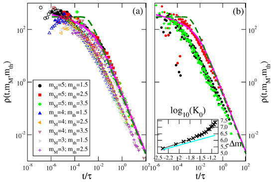 (Color online) (a) The same data in Figure 6 are plotted as function of , with proportional to (Equation (8)) with , for different values of and . Filled (empty) colored symbols are used for data of Region 1 (Region 2). The magenta continuous line is the scaling function with , and , whereas the dashed green line is the scaling function with , and . (b) The aftershock density in the ETASI1 catalog, with a blind time min, is plotted as a function of . Different values of and are plotted with different symbols: stars for , crosses for and plus for . Different colors correspond to different values of and of the average background rate : and days (black), and days (green) and and days (red). Magenta continuous and green dashed lines are the same scaling functions plotted in (a). (Inset) The value of (Equation (8)) as function of for the ETASI model with a blind time min (black crosses). The cyan line is the theoretical prediction (Equation (18)). From [31].