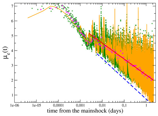 The quantity (green circles) after the the Hector Mine earthquake in California recorded at the station CIGSC located at a distance of 92 km from the main shock epicenter. The magenta crosses indicate the (logarithmically binned with bin value ) average value of , the red continuous lines represent the results of the logarithmic fit (Equation (13)) for . The dashed blue lines represent the quantity and orange lines are used for results of numerical simulations for the theoretical envelope , defined in Equation (15). The values of the best-fitting parameters in Equation (6) are days and s.
